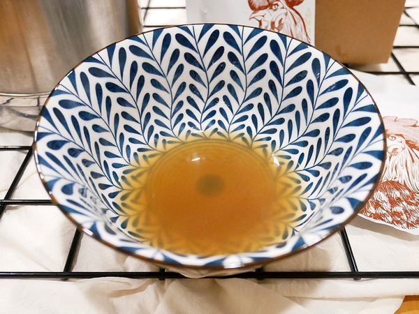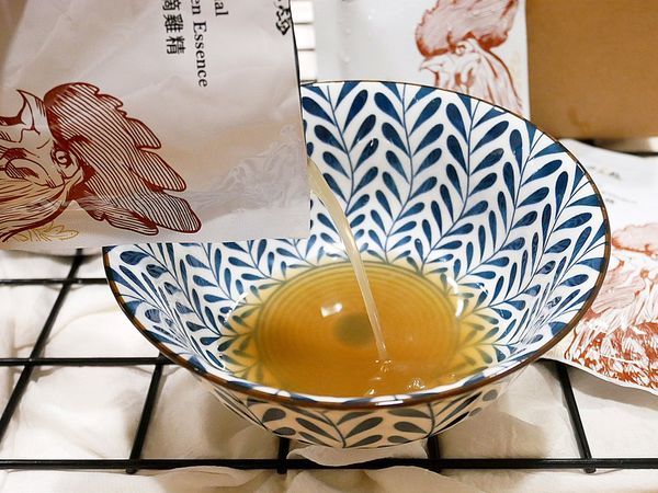 暖呼呼的金黃色雞精完全不鹹,入口沒有雞肉腥味,有點像烤雞的香氣,清爽的口感很耐喝,每天早上來一包輕鬆享用不耗時。