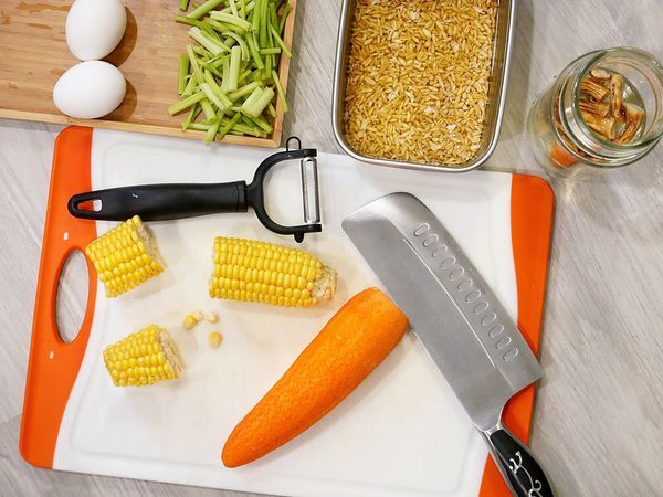 把玉米去梗、芹菜切珠,紅蘿蔔、香菇頭切小塊備用,