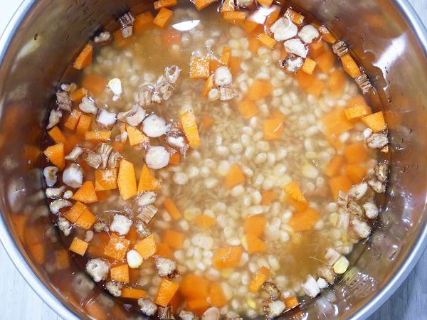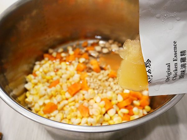 把切好的香菇頭、紅蘿蔔、玉米連同滴雞精和燕麥一起放到鍋中,