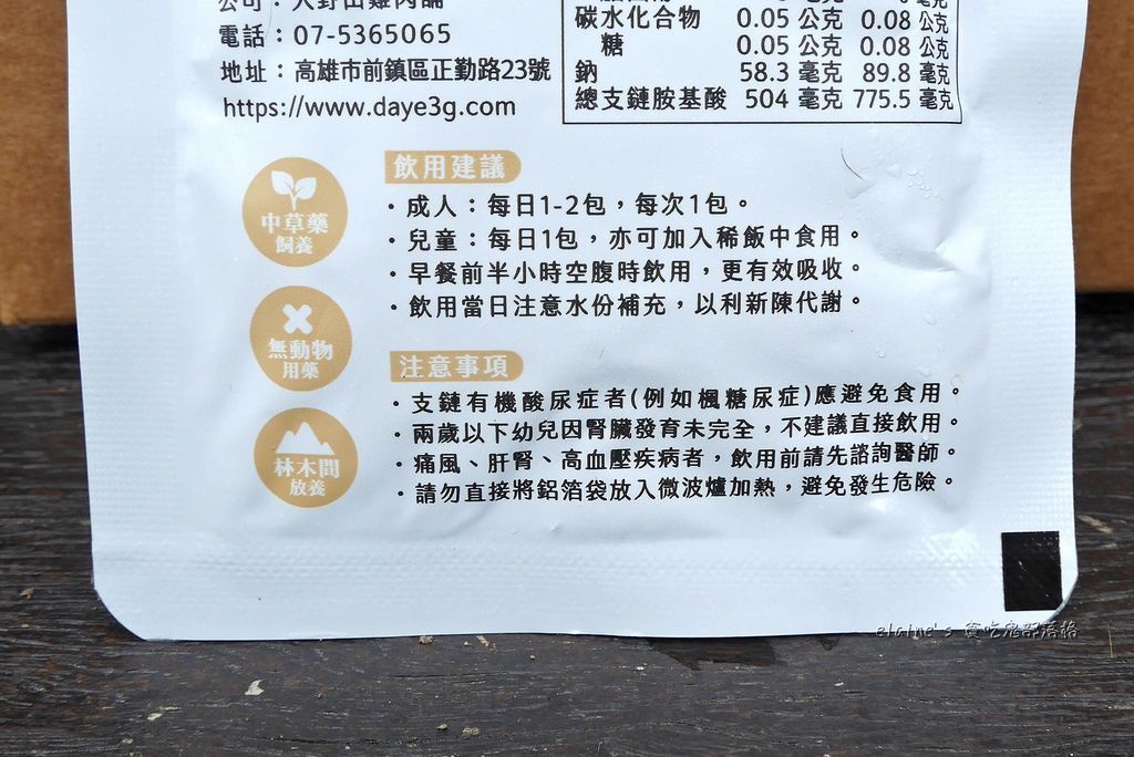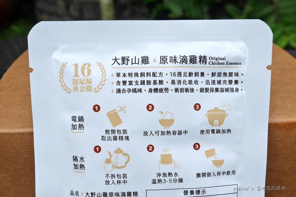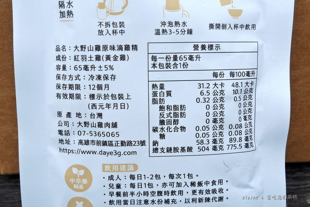 每個單獨的鋁箔便利包背後,都有 成份、營養標示、加熱方式、飲用建議、注意事項 等等詳細資訊