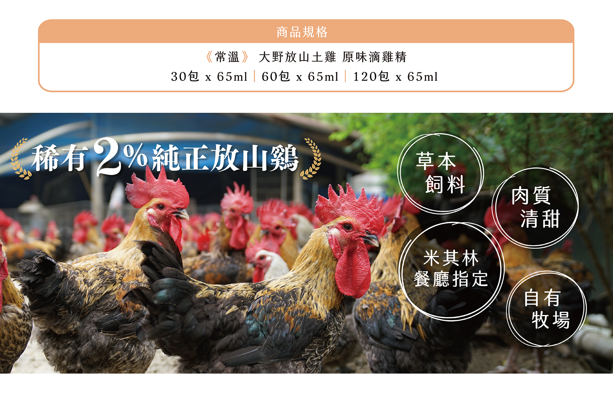 *100%使用來自大野山雞牧場,16週足齡全雞煉製