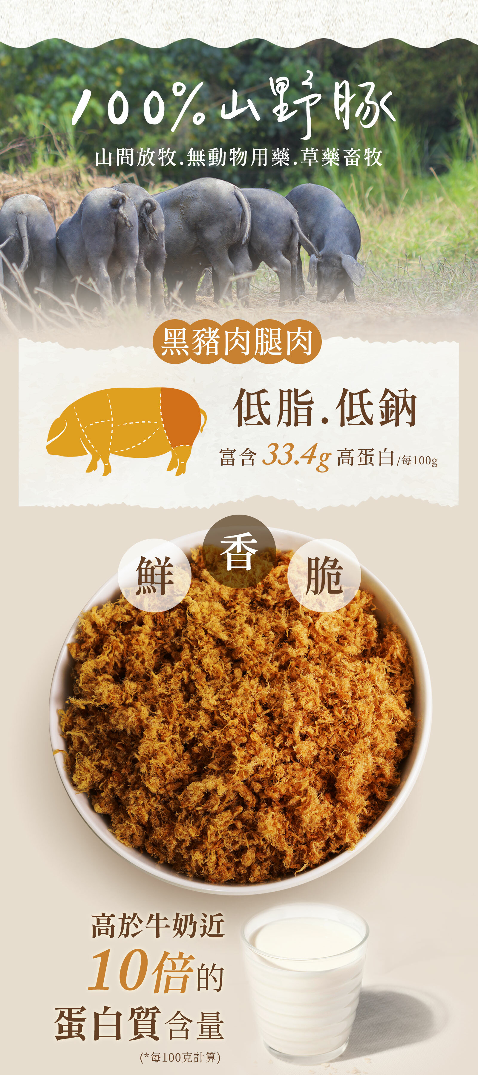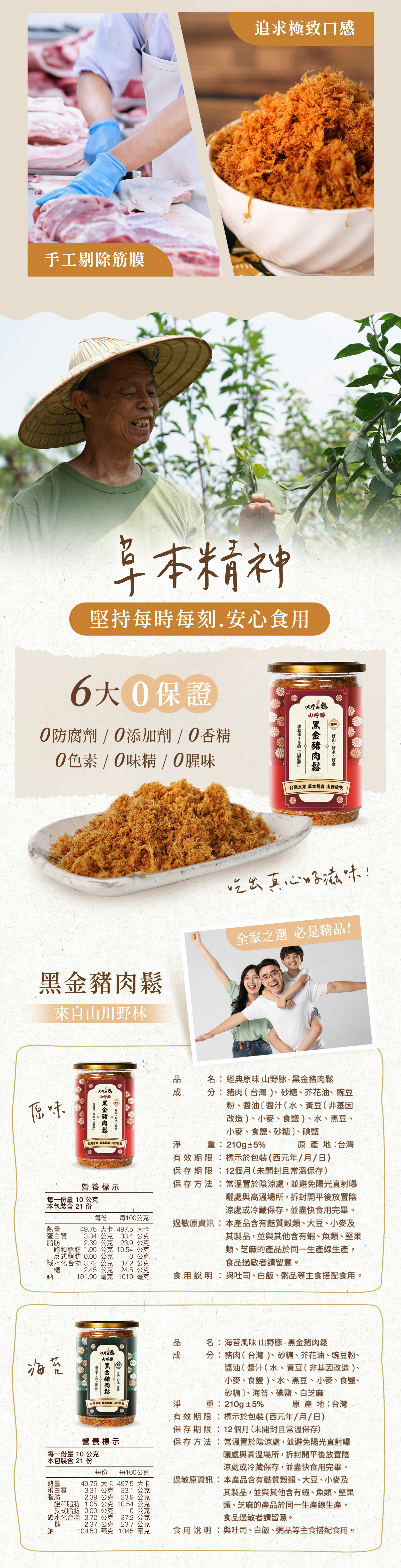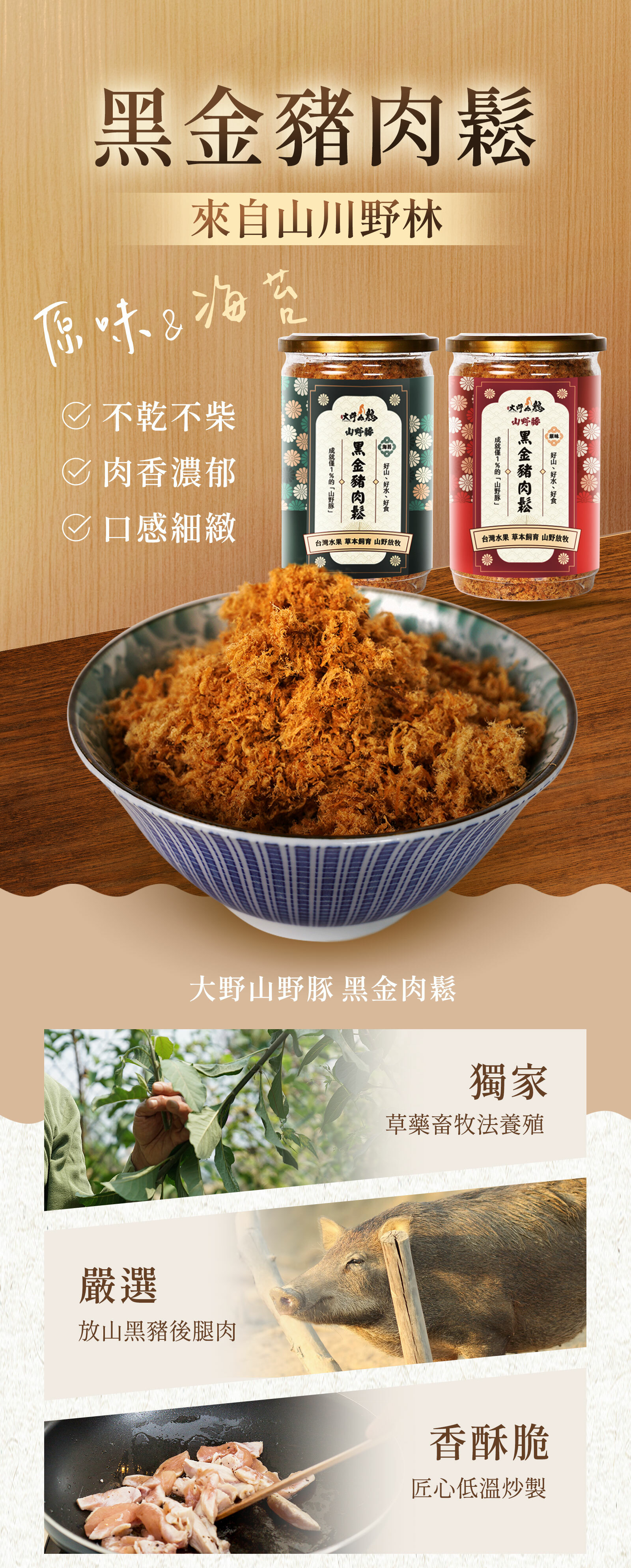 攜手製肉鬆經驗30年的專業老師傅共同研製,嚴選大野山山野豚,遵循古法,由老師傅掌握調味的美味秘訣,共推出「純豬肉鬆」與「海苔肉鬆」兩種口味。肉鬆纖維分明,嚐起來蓬鬆香脆,甜甜又鹹鹹,是大人小孩都無法抗拒的家常美味。